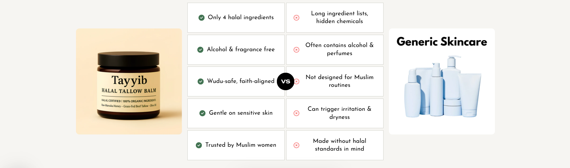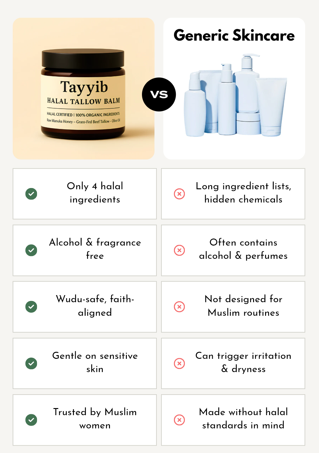 At Tayyib, we cut all of that out. Every ingredient we use is there for a reason: to repair, to soothe, and to keep your skin safe. It means our formula isn’t the cheapest to make — but it’s the one you can actually trust on your skin, day after day.